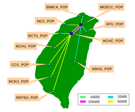 「亞太線上」提供TANET/I2的設備有Cisco 7505 Router、2509 Router、 Cisco LineStream 1010 ATM Switch(LS 1010)、Cisco Catalyst 2916 Switch 與 Modem。其中7505 Router與LS 1010均提供ATM-OC3的介面。 設備方面先將I2的LS 1010連接「區網」的LS 1010,再接到 I2的7505 Router,「亞太線上」以PVP的方式將7505 Router連接上TANET/I2骨幹,交換vBNS的路由資訊(教育部 ---> 區網LS 1010 ---> I2 LS 1010 ---> I2 R7505),然後I2 R7505再藉由與校內ATM骨幹連接之方式轉送路由資訊給校內 ATM 骨幹之 Router (I2 R7505-->7513NTU)。 在北區區網的分流計畫裡,其封包出口路徑為Cabletron SSR8600 --->(rip)R7513(ospf) ---> 區網LS 1010 ---> 教育部。其中R7513身兼台大與區網之路由出口,其對台大內部LS 1010的部分,我們採用Access-list deny的方式,隔絕非140.112.0.0(台大網段)的路由資訊。如此一來,R7513便不會有TANET/I2的路由資訊,而北區區網的網路封包也得以隔絕,不致進入TANET/I2骨幹網路。 TANET/I2之連線架構如下【細節】:
