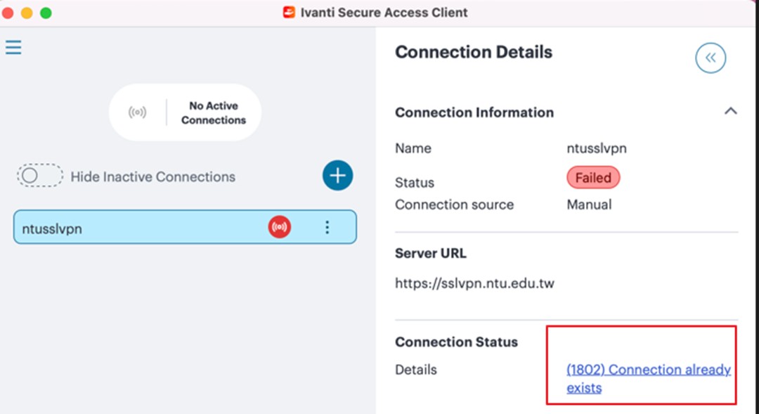 出現「正在保護連線安全」、「您的連線已失敗」或「未能設定虛擬配接卡」等錯誤訊息的可能原因如下: