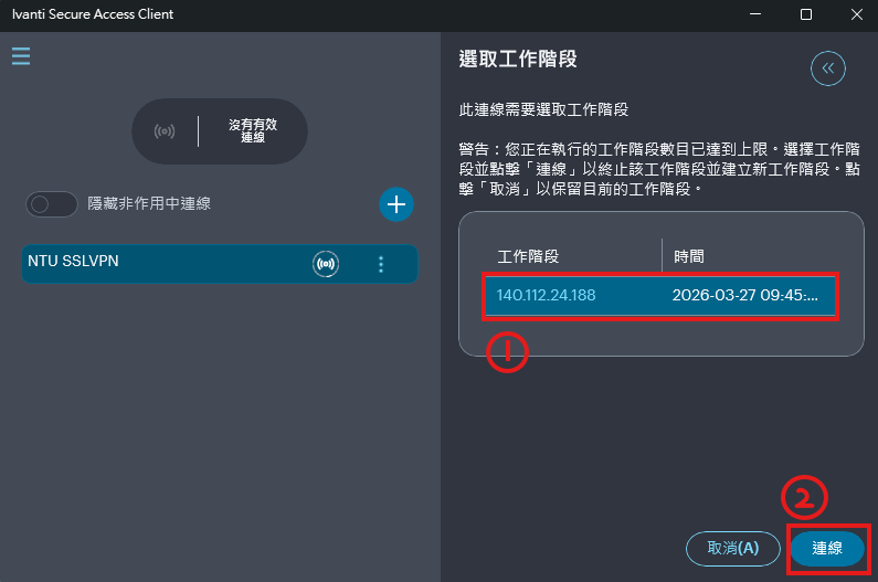 因本服務目前僅提供每個帳號一台裝置連線使用VPN於同一時間,若其他裝置未登出可參考下圖操作切換設備: